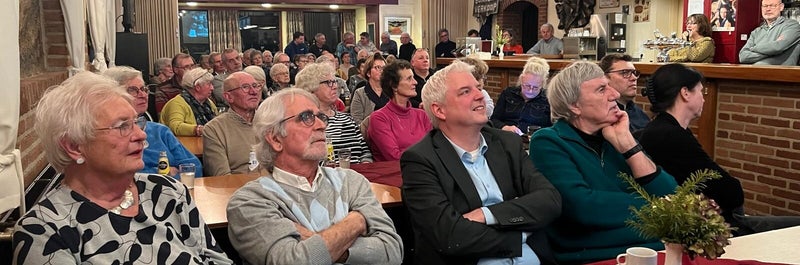 Wim Meens nam ons mee op een fototocht door Sweikhuizen. De zaal genoot zichtbaar van de beelden van maar liefst zeven cafés in het dorp, wat meteen de tongen losmaakte. Er kwamen prachtige verhalen naar boven over de mensen die vroeger in Sweikhuizen woonden, oude evenementen en de herinneringen die daarbij horen. Jan Boijens voegde hieraan toe dat er onderaan de berg nóg een café was, wat de teller op acht brengt. Piet Boyens wist op zijn beurt te vertellen waar de naam *De Swaen* vandaan kwam, geïnspireerd door een schilderij.